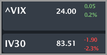 The Charts Tab (6 months) for the VIX is below (click to enlarge). The top portion is the spot value, the bottom is the vol (IV30™ - red vs HV20™ - blue). The yellow shaded area at the very bottom is the IV30™ vs. the HV20™ vol difference.